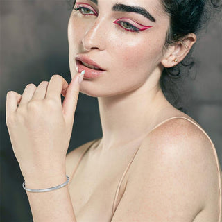 This 9K white gold bangle features a diamond-cut flat tube design, showcasing a sleek and modern aesthetic. The diamond-cut finish enhances the bangle's shine and texture, creating a brilliant sparkle that catches the light beautifully. Perfect for both everyday wear and special occasions, this bangle adds a touch of sophistication and elegance to any jewellery collection.