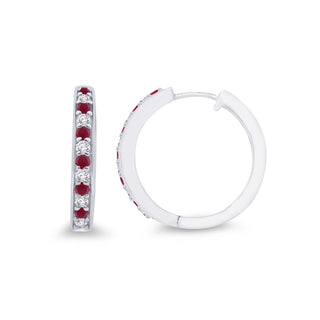 A gorgeous pair of diamond and ruby hoop earrings. Set in 9K white gold, these will add a subtle splash of colour and sophisticated sparkle. Their classic design means these hoops will become an absolute staple.
