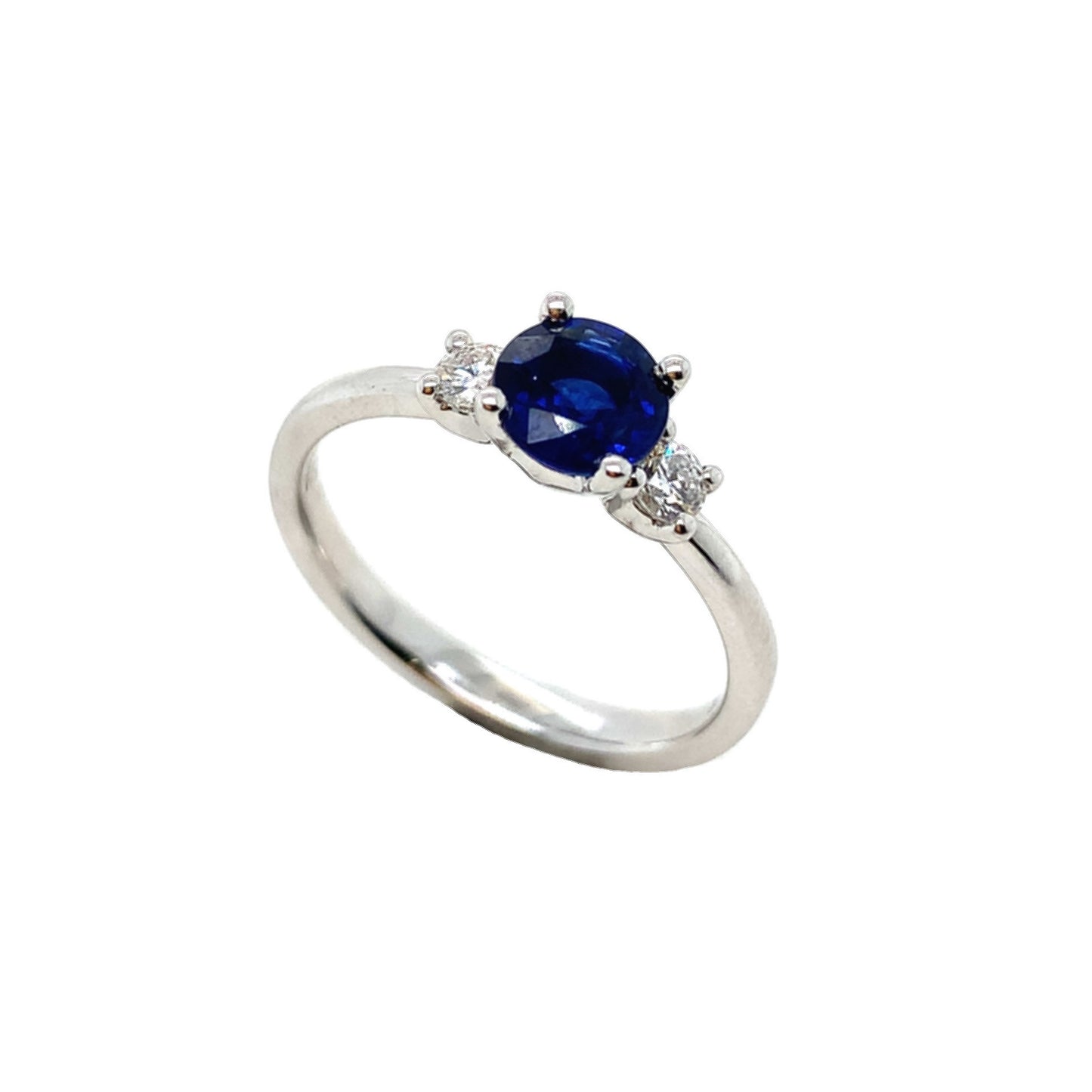 A classic and timeless design, this sapphire and diamond ring will add a splash of colour to your look. Featuring a deep blue round cut sapphire flanked by two round brilliant diamonds on a 18K white gold band. Instantly elevating any outfit, this ring is sure to become a fast favourite.
