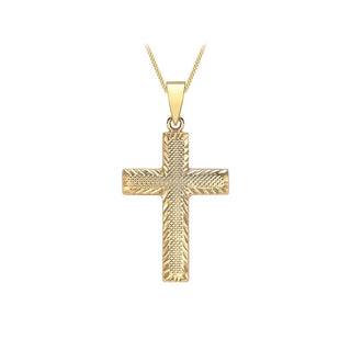 This 9K yellow gold cross pendant showcases a diamond-cut textured finish, creating a striking interplay of light and shadow. The detailed surface adds dimension and a subtle sparkle, enhancing the classic cross shape with modern sophistication. A standout piece that combines traditional symbolism with contemporary flair.