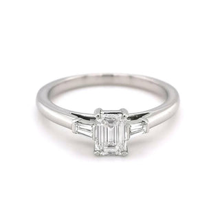 This timeless elegant Platinum 0.66ct Emerald Cut Diamond Ring is held in a beautiful 3 stone setting with 2 Tapered Baguette Cut Diamond outers.